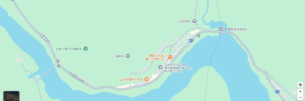 鴨沢は、秩父多摩甲斐国立公園の中にあり、自然に囲まれた美しい地域で、豊かな森林と清らかな空気が訪れる人々を魅了しています。