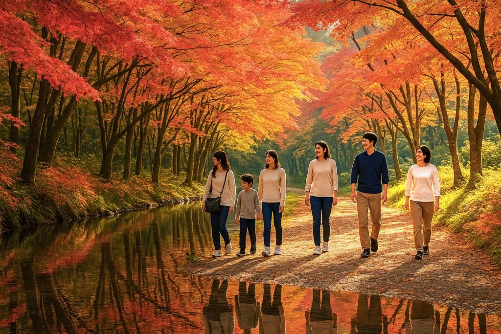 まず訪れたいのは「もみじの森」。鮮やかな赤や黄金色の葉がトンネルをつくり、足元の落ち葉を踏むたびにカサカサとやさしい音が響きます。