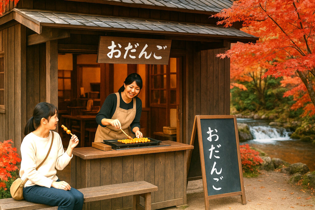 地元産米粉と国産小麦をブレンドしたもちもちの団子を、備長炭で丁寧に焼き上げ、特製の甘じょっぱいタレを塗り重ねる逸品です。焼き立ての香ばしさとタレのコクが絶妙にマッチし、観光の合間や散策の小休憩にぴったり。店内には木製ベンチがあり、紅葉の季節は店先のもみじを眺めながら味わえます。